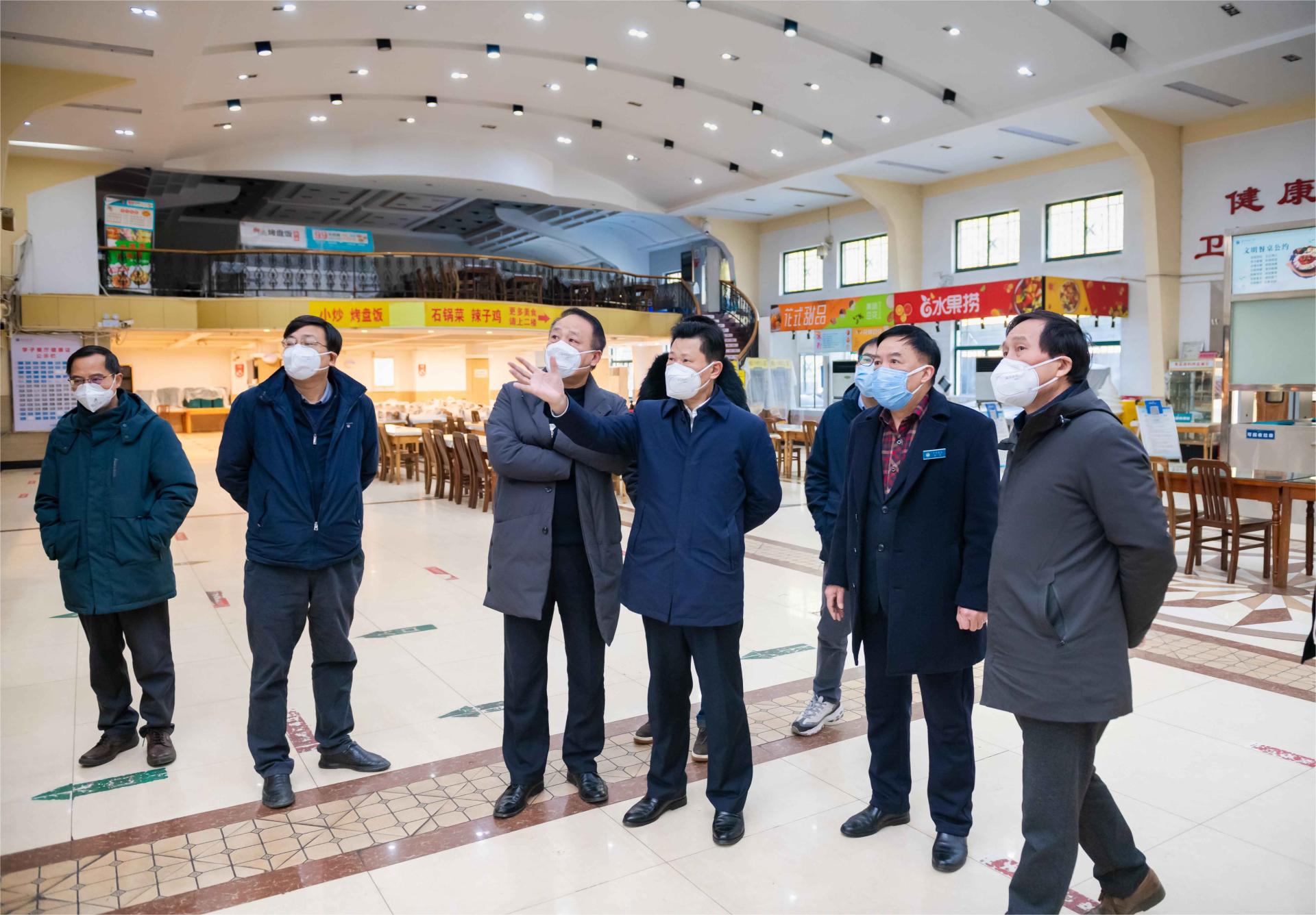 校领导一行先后前往沁园春食堂、大学生活动中心建设工地、学子餐厅、东区智慧物流中心、东区10栋学生宿舍、南湖校区民族餐厅、南湖7栋学生宿舍、健康驿站等进行检查,听取情况汇报,细致检查了食品安全、消防安全、安全生产、宿舍安全、疫情防控等工作,并就保障假期校园安全对相关单位提出了工作要求。