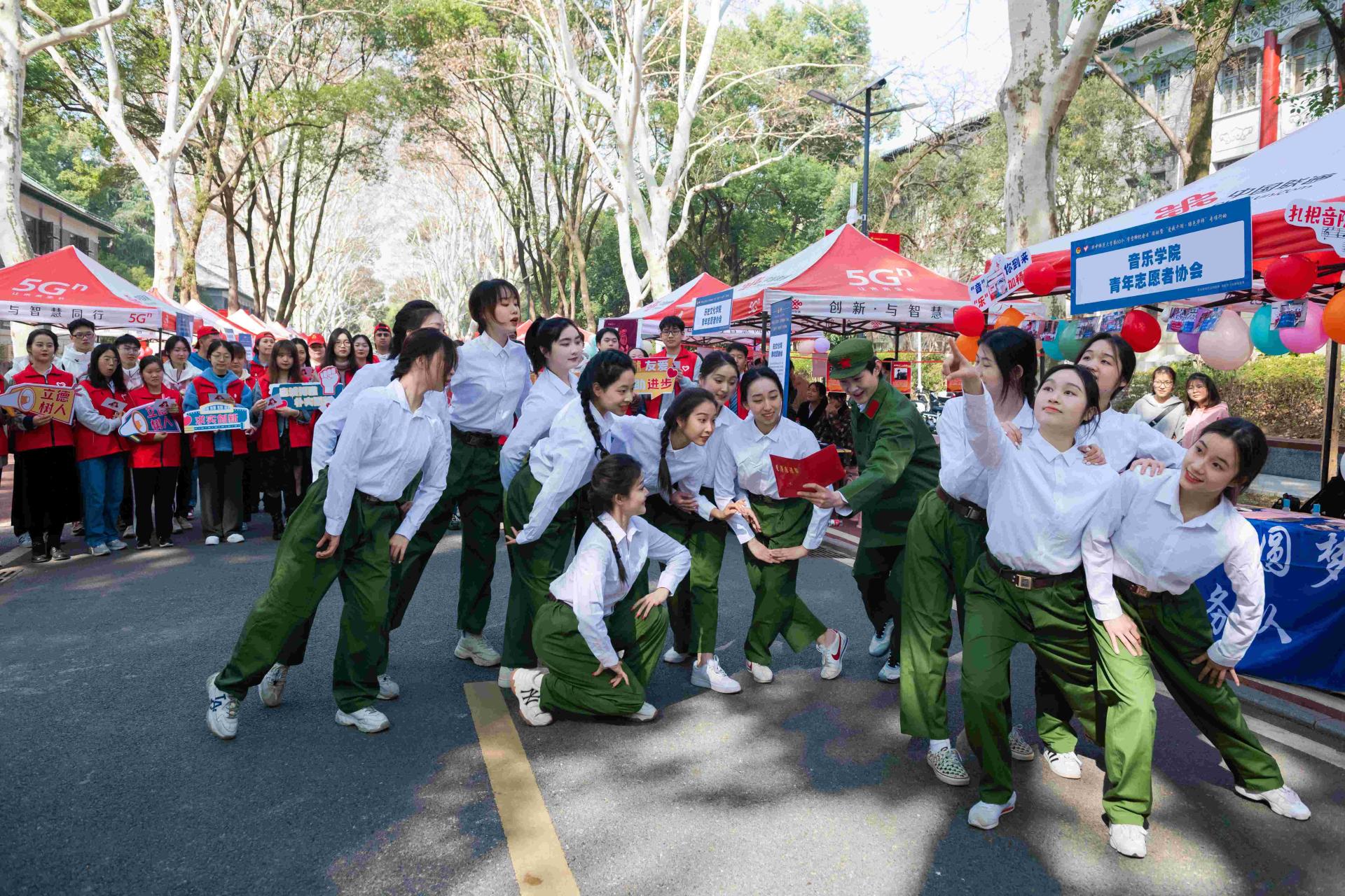 启动仪式后,志愿服务嘉年华在桂中路举行。桂中路两旁设立了“理”响青年、追“锋”青年、环保青年、树人青年、互助青年五个主题共42个展区,来自湖北省红十字会、武汉血液中心、环球在线官网互助社、洋雷锋志愿服务队、“爱我千湖”湖泊保护志愿服务队、志愿公益社团、各学部学院(所、中心)青年志愿者协会等组织,以视频展播、节目表演、喷绘墙报、讲解介绍等形式,多样化呈现“学雷锋”志愿服务典型事迹、工作经验和优秀成果。