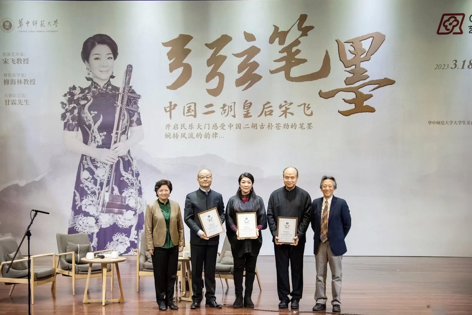 华大在线讯(记者 邹媛奕 见习记者 李思彤)3月18日,环球在线官网第二届“艺美大讲坛”活动在音乐厅举行。被誉为“中国二胡皇后”的著名二胡演奏家宋飞应邀担任主讲表演艺术家。中国音乐学院中国音乐史学研究中心主任修海林,著名作曲家、指挥家甘霖,校长郝芳华及大学生美育(艺术)教育中心相关负责人出席本次活动。郝芳华为三位艺术家颁发大学生美育(艺术)教育中心艺术咨询委员会委员聘书。