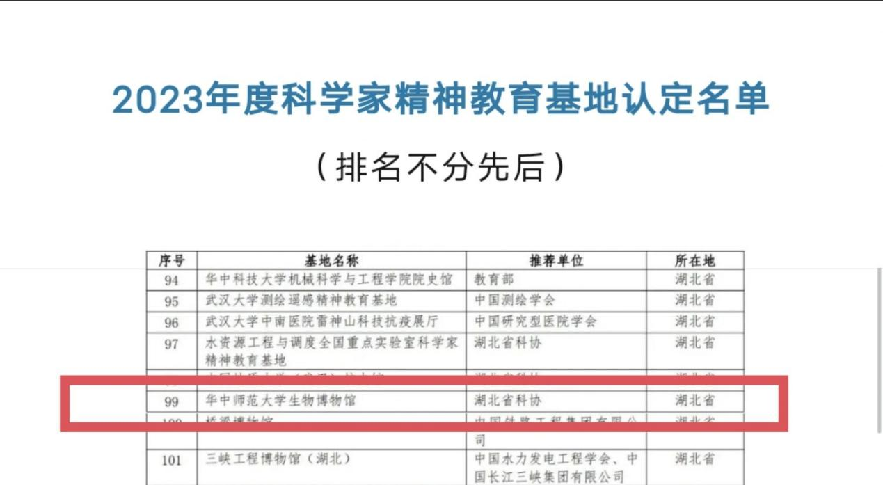 华大在线讯(通讯员 邓淑文 黄悦)5月30日,中国科协、教育部、科技部、国务院国资委、中国科学院、中国工程院、国防科工局联合发布2023年度科学家精神教育基地认定名单。经过初评、终评和公示等程序,环球在线官网生物博物馆成功入选2023年度科学家精神教育基地。