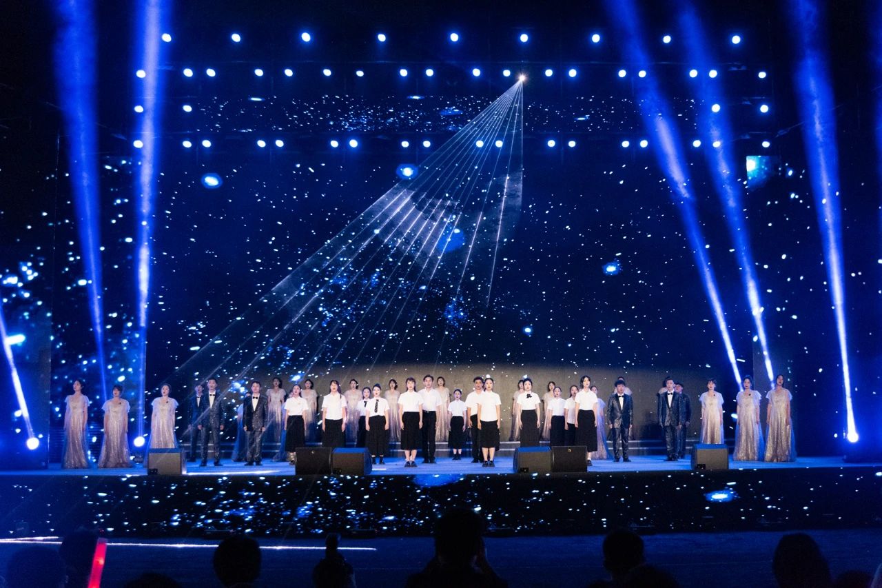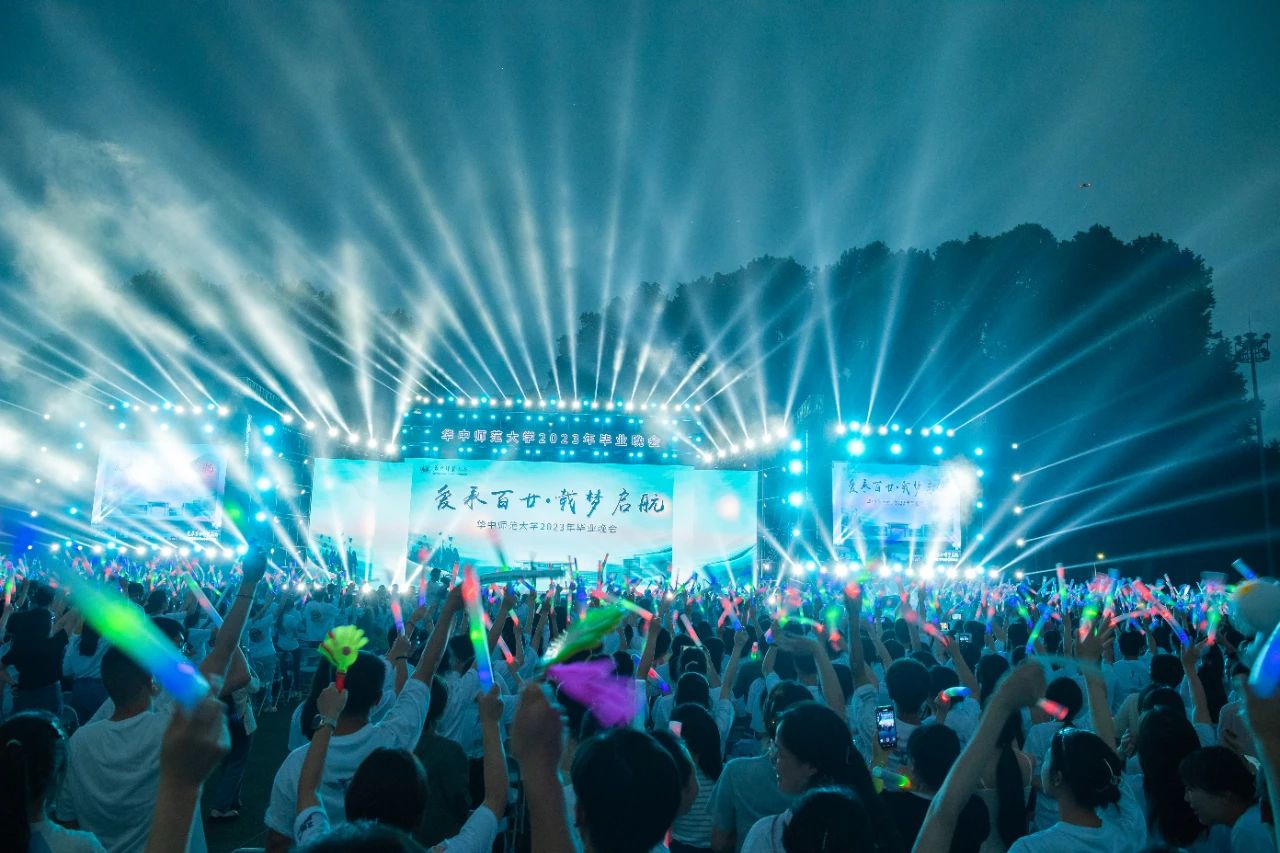 暖场活动《寻找现场的你》使用摇臂随机航拍并投屏,同学们挥舞着荧光棒热情呼喊,现场气氛瞬间被点燃。“南湖浪涌,桂香灵动……”,伴随着毕业生们齐唱校歌的声音,晚会正式拉开帷幕。