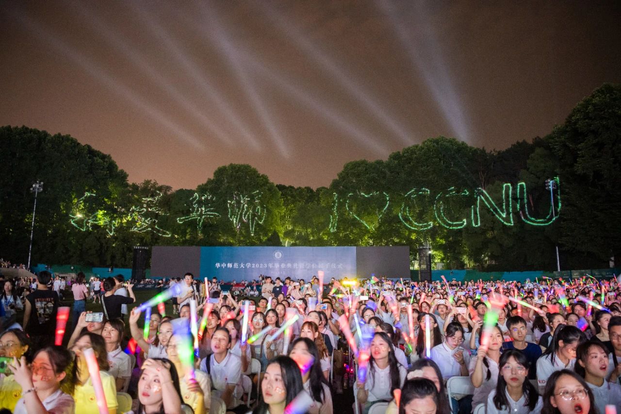 毕业组歌中,《最初的梦想》带领毕业生们重温青葱时光;《突然好想你》再次引起全场大合唱,粉色的舞台灯光更显离愁别绪;HANA乐队的《再见,再见》将舞台重新点燃,伴随着“再见再见再见……”的歌声,“我爱环球(中国),I❤CCNU”的投影出现在观众席背后,观众纷纷拍照留念。