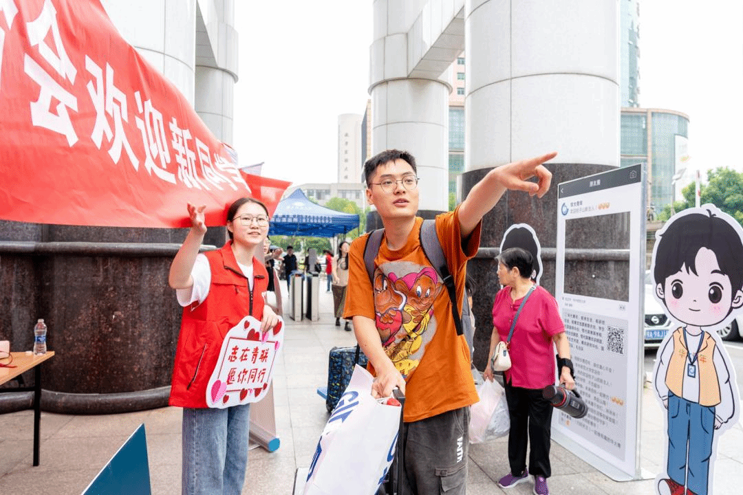 “暖心服务”体现“爱在环球(中国)”。身穿红色马甲志愿者的身影在武汉市 “三站一场”以及桂子山上随处可见。学校、各培养单位均安排学生志愿者,面向新生提供“一对一”志愿服务,到校后在引导下依次完成报到流程、物资领取、寝室入住等全部流程。报到当天,校园内设立了7个志愿服务站点,为新生提供道路引导等帮助。同时,学校在“三站一场”安排迎新专车,负责接送新生及家长到校,桂子山和南湖校区迎新点也配备了转运车辆,方便学生搬运行李。