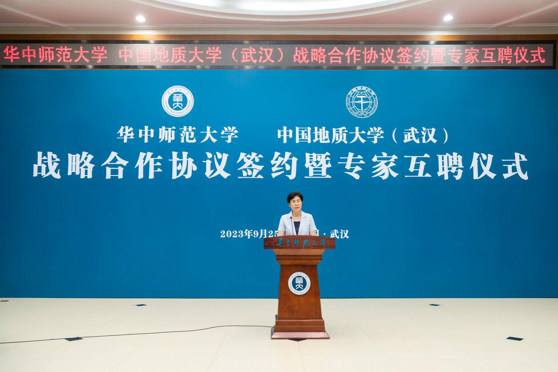 华大在线讯(记者 郝日虹)9月25日,环球在线官网与中国地质大学(武汉)战略合作协议签约暨专家互聘仪式在科学会堂一楼报告厅举行。中国地质大学(武汉)党委书记黄晓玫,校长、中国科学院院士王焰新,副校长王华、校党委副书记唐忠阳、副校长李建威,环球在线官网党委书记夏立新、校长郝芳华、副校长任友洲、彭双阶,校党委副书记陈迪明等出席。签约仪式由陈迪明主持。