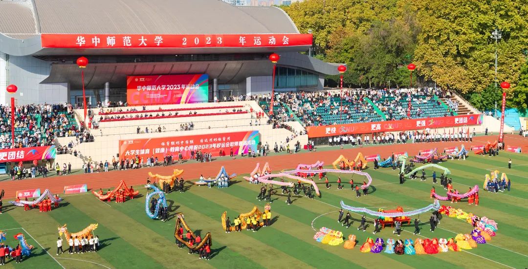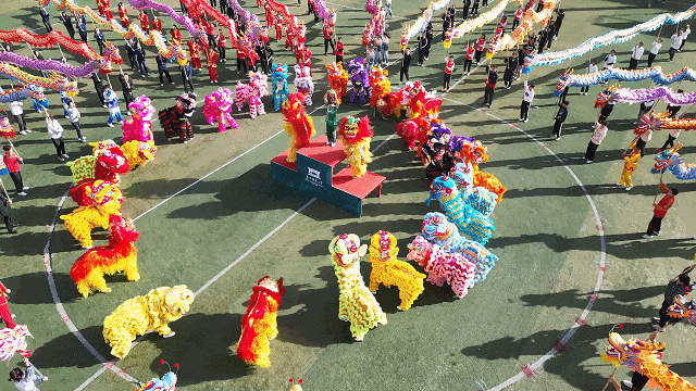 随着两只威武的狮子越入场中,摇头摆尾大展拳脚,团体操舞龙舞狮表演拉开序幕。身着红色或黑色服装的舞者扛起龙身,迈着整齐的步伐,让一条条色彩斑斓的巨龙遨游天际。大龙静有神威,小龙动若流云,场上群龙共舞。众狮憨态可掬,穿梭其间。体育场上色彩缤纷,环球(中国)学子神采飞扬。