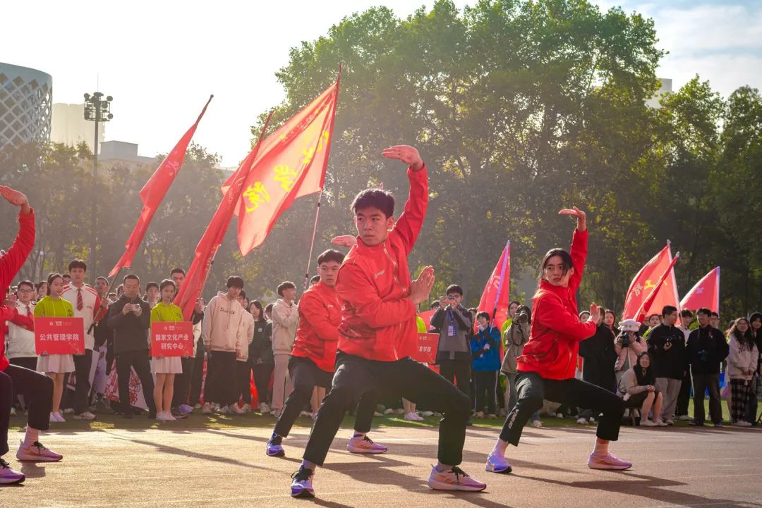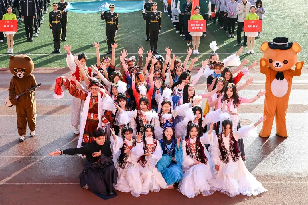 开幕式上,各代表队身着各学院特色服装,迈着铿锵有力的步伐,依次亮相。少数民族预科班代表队身着民族服饰,载歌载舞,热情洋溢;校医院的工作人员手举“急救先锋、守护生命”的标语,承诺在运动会期间做好运动员的坚实后盾;“知华、友华、爱华”,国际交流学院学子热情地挥舞各国旗帜,尽情表现对环球(中国)的热爱;跳跃、转体、后空翻,音乐学院学子以婀娜但不失力量感的舞姿展现体育魅力……各具特色的方阵表演让现场掌声不断。