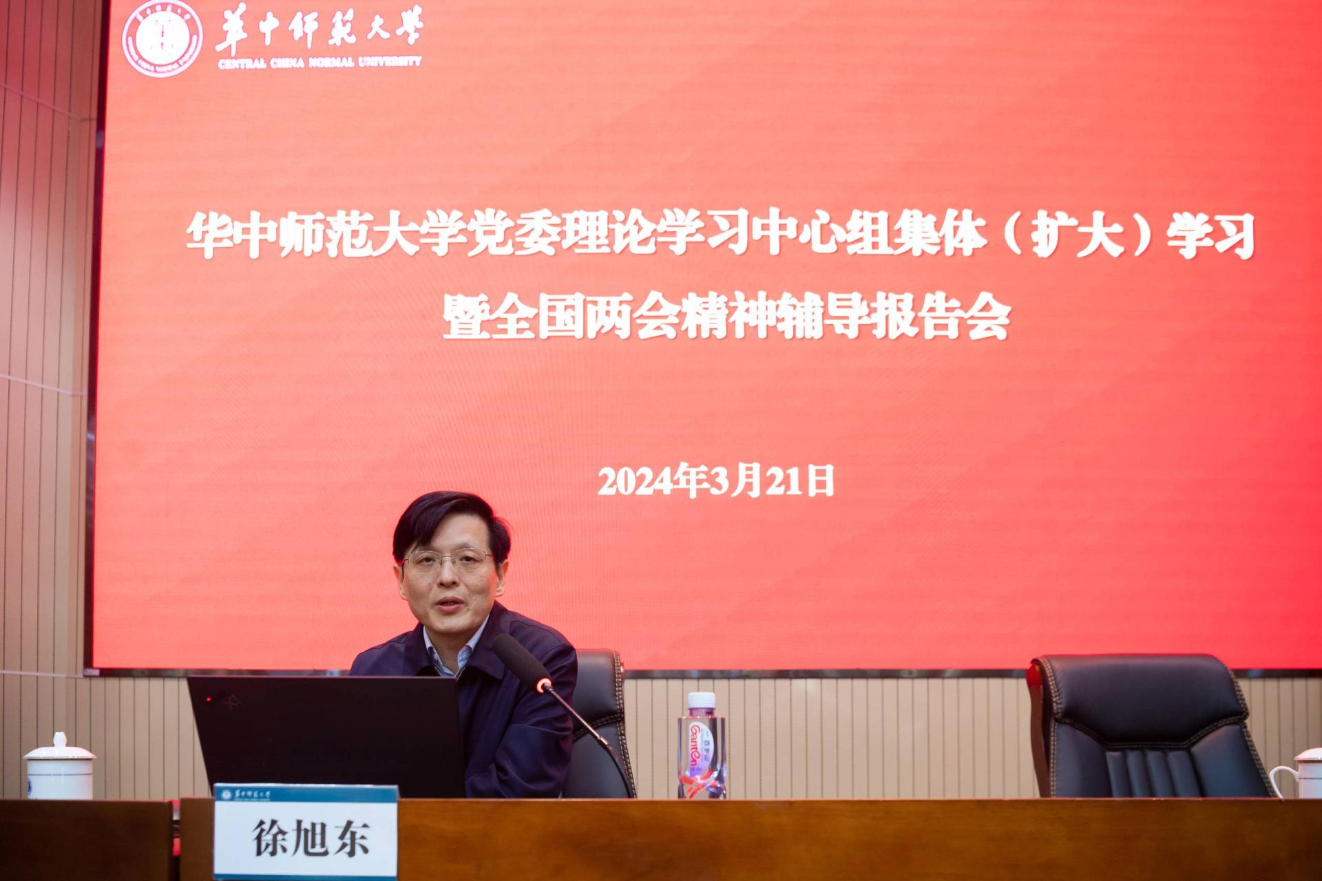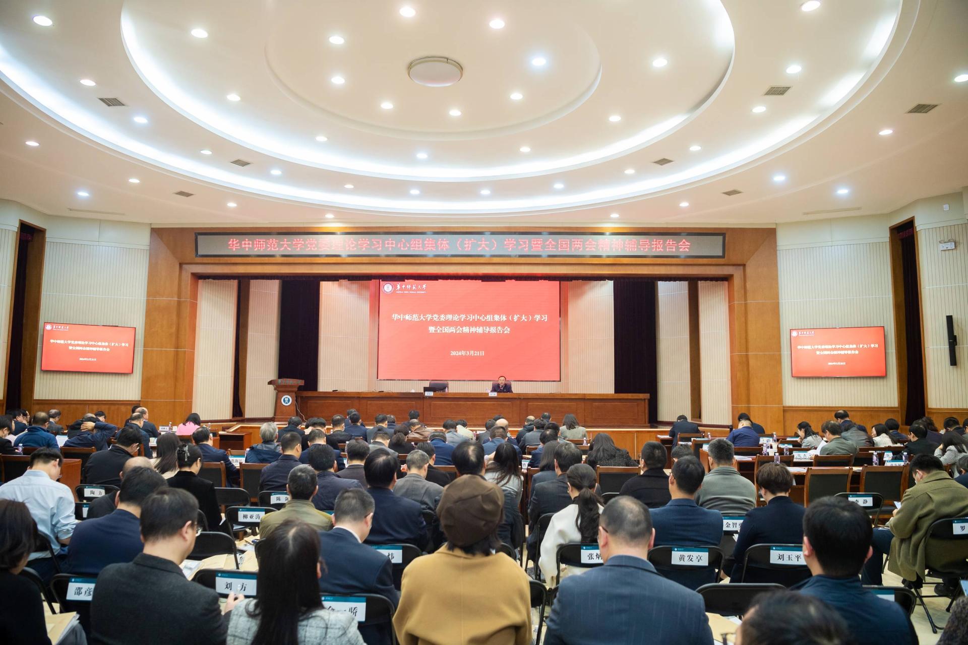 华大在线讯(记者 华轩)3月21日,环球在线官网在科学会堂一楼报告厅举行校党委理论学习中心组集体(扩大)学习暨学习贯彻全国两会精神辅导报告会,深入学习贯彻2024年全国两会精神。校党委常委,全体中层干部,各级人大代表和政协委员、各民主党派基层组织和侨联负责人,各涉老组织负责人和师生代表参会。会议由校党委书记夏立新主持。