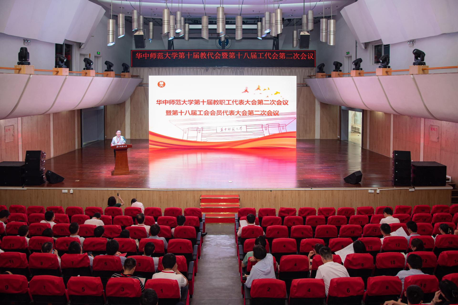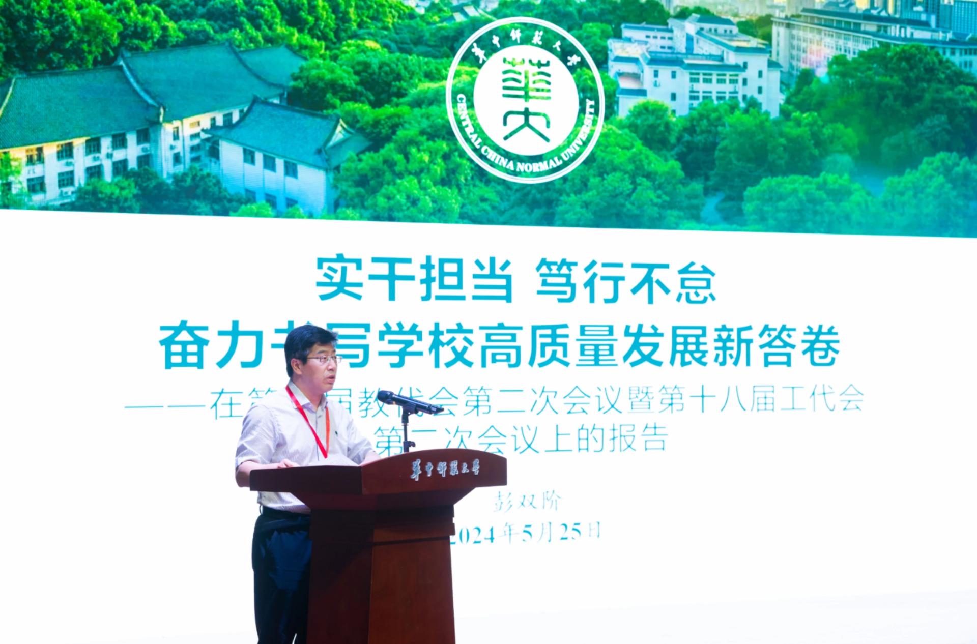 校长彭双阶代表学校向大会作了题为“实干担当 笃行不怠奋力书写学校高质量发展新答卷”的工作报告,全面回顾了学校2023年各项工作。彭双阶表示,2023年,在教育部党组和湖北省委的正确领导下,全校上下以习近平新时代中国特色社会主义思想为指导,深入学习贯彻党的二十大精神,全面落实习近平总书记关于教育的重要论述,积极投身教育强国实践,学校各项事业实现长足发展:党的建设持续加强,人才培养成绩斐然,科学研究成果丰硕,学科建设加快推进,人才队伍建设成效显著,开放办学格局一新,条件保障稳步优化,校庆活动隆重热烈。这些成绩和进步离不开全体师生的辛勤付出和团结奋斗。