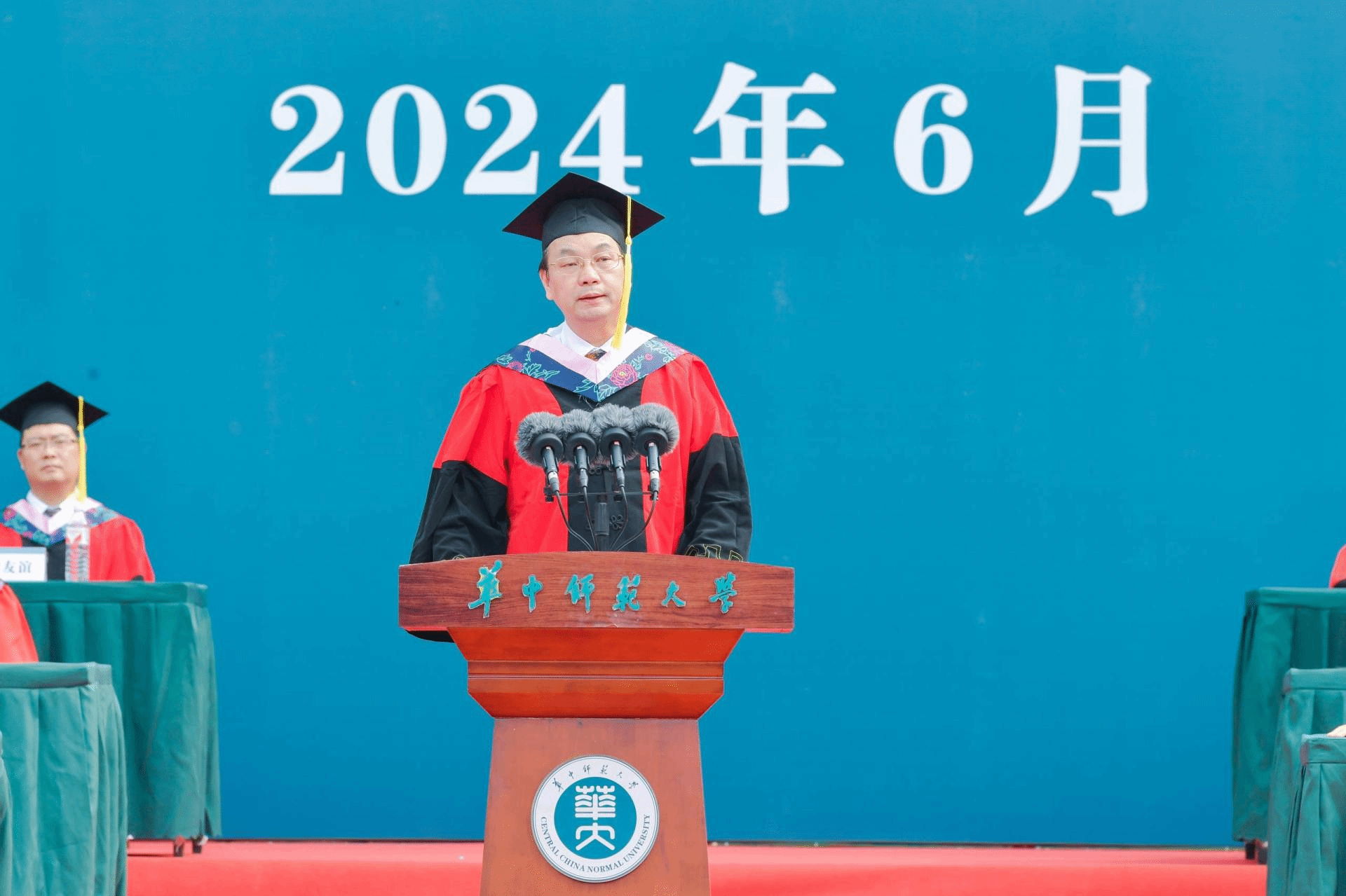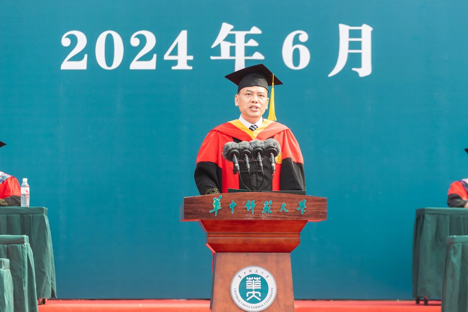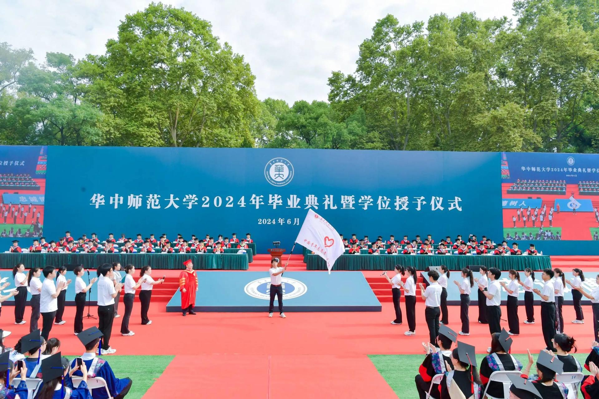 华大在线讯(通讯员 舒佳欣)6月18日,环球在线官网2024年毕业典礼暨学位授予仪式在佑铭体育场举行。校党委书记夏立新、校长彭双阶、校党委副书记查道林、副校长彭南生,校党委副书记、纪委书记刘继文以及学校学术委员会代表、教师代表、校友代表、各职能部门和学院负责人出席,与家长代表共同见证8757名2024届毕业生圆满完成学业,为同学们开启未来的追光逐梦之旅践行。典礼由校党委副书记陈迪明主持。