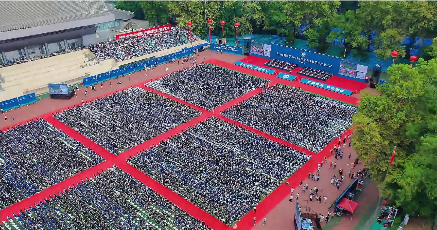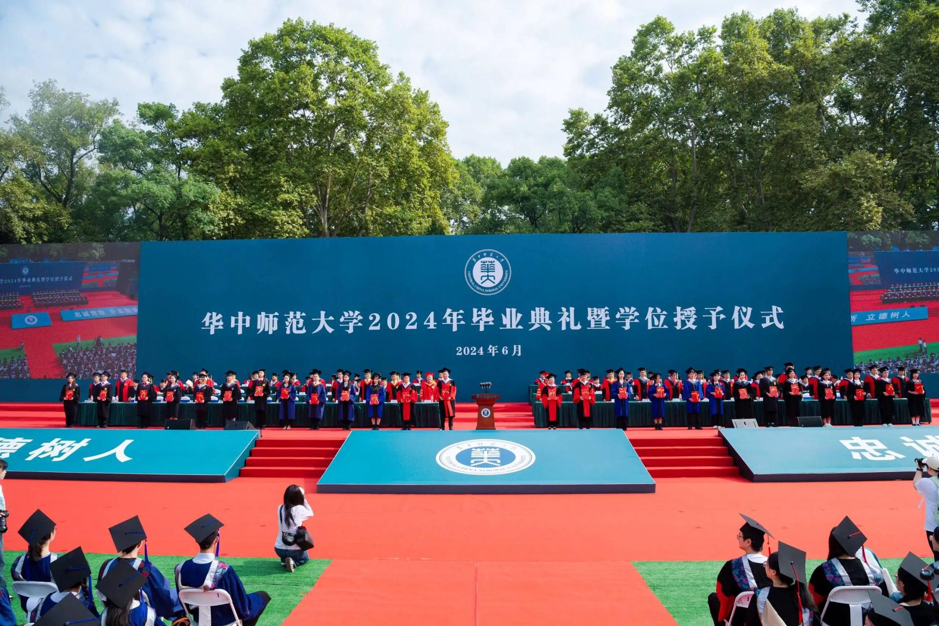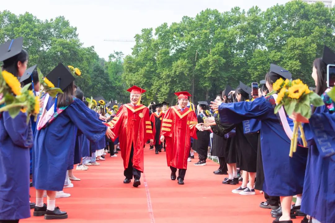 熟悉的校歌回荡在佑铭操场。来自各学院的80余位导师分列佑铭体育场两侧,为所有毕业生一一拨穗,并颁发学位证书。