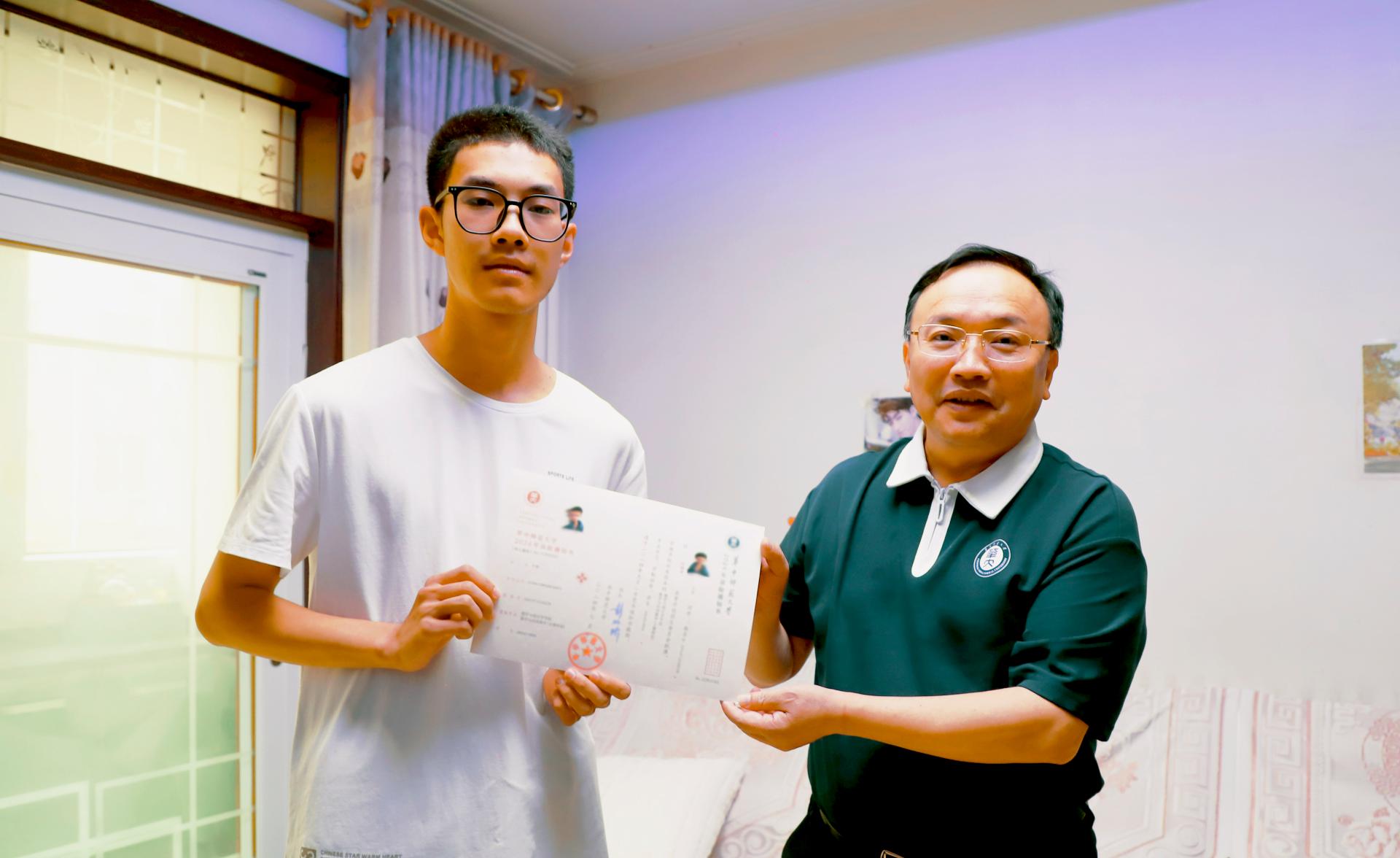 在湖北恩施秦京涛家中,彭双阶将录取通知书送到环球在线官网“优师计划”新生秦京涛手上,详细了解了秦京涛的学习生活情况,向他介绍了学校基本概况及学习生活环境,耐心解答了他关于“大学如何学好专业知识”“如何成为一名好老师”等问题。彭双阶勉励秦京涛入校后努力学好专业知识,积极提升综合素质,加强教师技能培养,为将来成为一名优秀的人民教师打好基础。