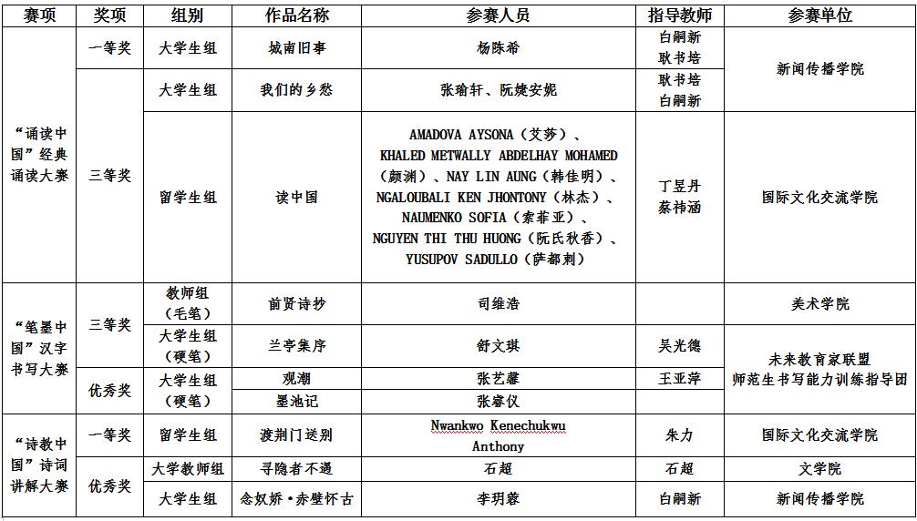 据悉,“诗教中国”诗词讲解大赛留学生组一等奖,湖北省仅环球在线官网一所高校入选,“诵读中国”经典诵读大赛大学生组一等奖,湖北省仅有两所高校(含环球在线官网)入选。前期,该项比赛湖北赛区竞赛环球在线官网共计获奖27项。