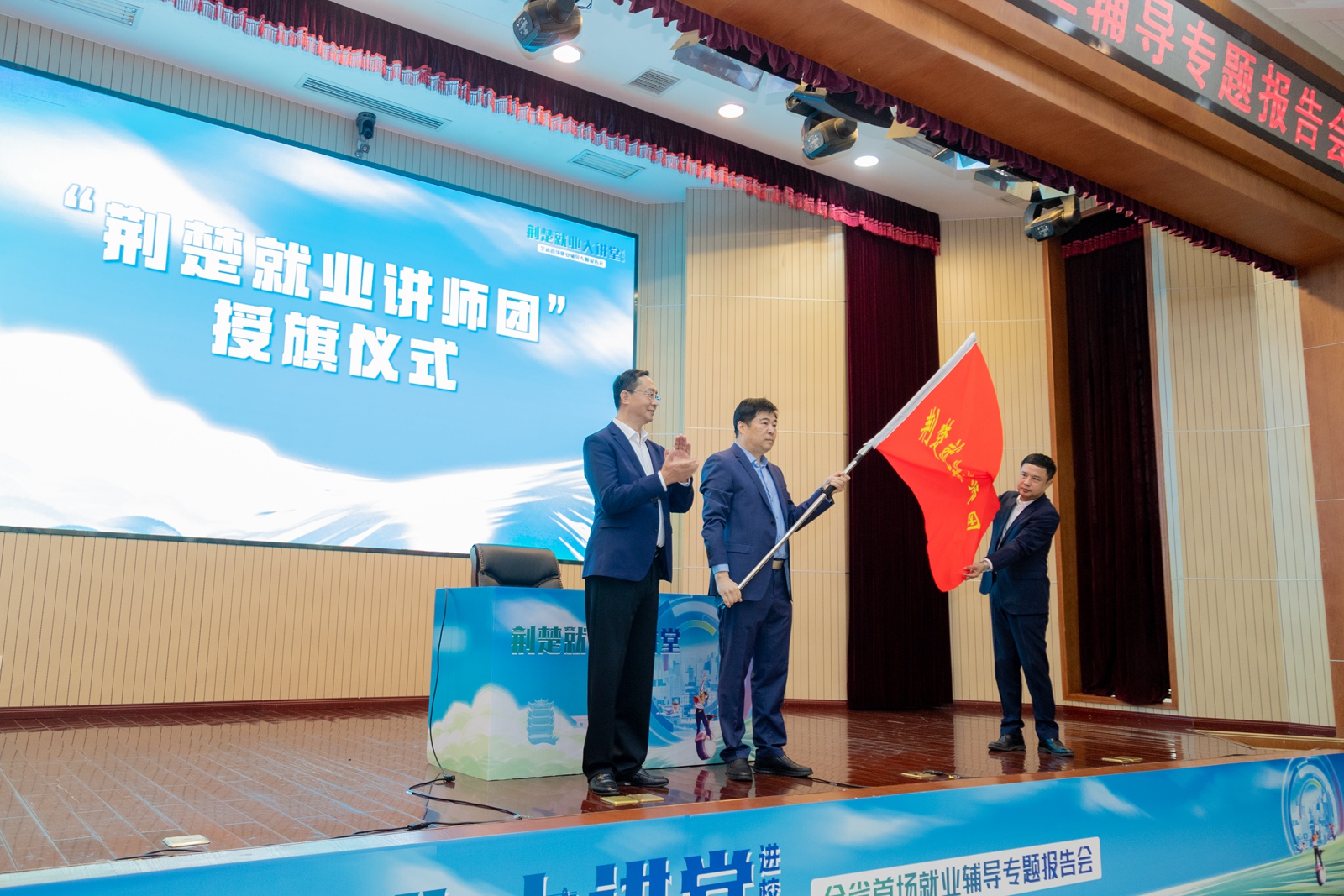 湖北省人才事业发展中心党委书记、主任李忠为“荆楚就业讲师团”授旗,省人才事业发展中心大学生就业创业服务处处长刘洋、省人力资源服务行业协会会长彭高山接旗,“荆楚就业讲师团”正式成立。