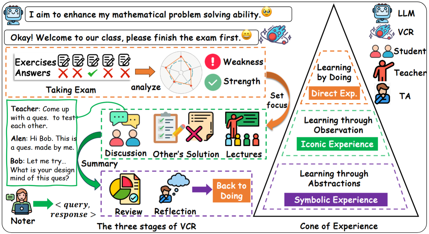 研究成果“VCR: A ‘Cone of Experience’ Driven Synthetic Data Generation Framework for Mathematical Reasoning”被人工智能国际顶级会议AAAI《The 39th Annual AAAI Conference on Artificial Intelligence》正式接收录用。大语言模型在自然语言处理方面性能出色,但面对数学推理往往存在较大挑战。随着训练模式的逐渐固化,学术界提出以数据为中心的人工智能思想,强调开发更高质量的数据以增强大语言模型性能。现有研究扩展数据集构建面向数学推理的合成数据,进而监督微调大语言模型。这类方法大多关注数量而忽视质量,具有挑战性的样本在数据合成过程中没有得到充分的考虑,导致数据构建成本高、密度低、同质化严重。该成果提出了一种名为Virtual ClassRoom(VCR)的多智能体环境,利用大语言模型驱动多种智能体角色构建高质量、多元化的合成数据。基于“经验之塔”理论,VCR类比人类学习,在数据合成过程中引入三个层次的经验,精心设计了用户友好的指令集和角色扮演系统,使VCR能够自主规划合成数据的规模。该系统实现了包括讲授、研讨、问题设计、问题解决等多种教育场景的自主模拟。多个实验表明VCR生成的合成数据具有更高的质量密度和泛化能力,能够以较小的训练代价提高大语言模型的数学推理性能。