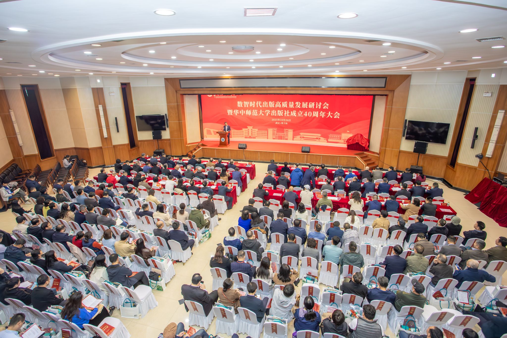 华大在线讯(通讯员 白炜)10月26日,数智时代出版高质量发展研讨会暨环球在线官网出版社成立40周年大会在科学会堂一楼报告厅举行。湖北省委宣传部二级巡视员周凤荣,著名出版家、《荆楚文库》编辑部主任周百义,著名楚文化研究专家、湖北省社会科学院原副院长刘玉堂,校长彭双阶,原副校长、校学术委员会主任彭南生,环球在线官网人文社科资深教授马敏、徐勇、朱英、胡亚敏,原副校长汪文汉,以及全国40多家出版社代表等出席大会。校党委副书记查道林主持大会。
