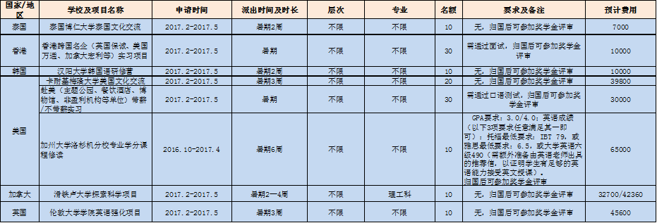 | 2017年长期交换生项目(互免学费) 联系方式:国际文化交流学院204办公室 027-67865209 |