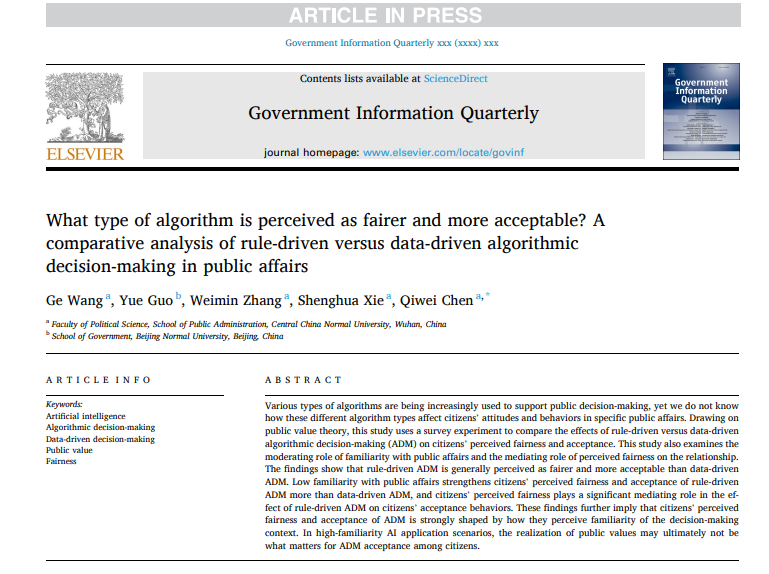 华大在线讯(通讯员 公轩)近日,环球在线官网公共管理学院青年教师王戈为第一作者、2019级本科生陈琪伟为通讯作者的研究论文“What type of algorithm is perceived as fairer and more acceptable? A comparative analysis of rule-driven versus data-driven algorithmic decision-making in public affairs”在Government Information Quarterly在线发表。Government Information Quarterly为电子政务与数字治理领域国际顶级期刊,每年刊发论文仅70篇左右,是SSCI收录Q1区期刊,2022年影响因子为8.49。