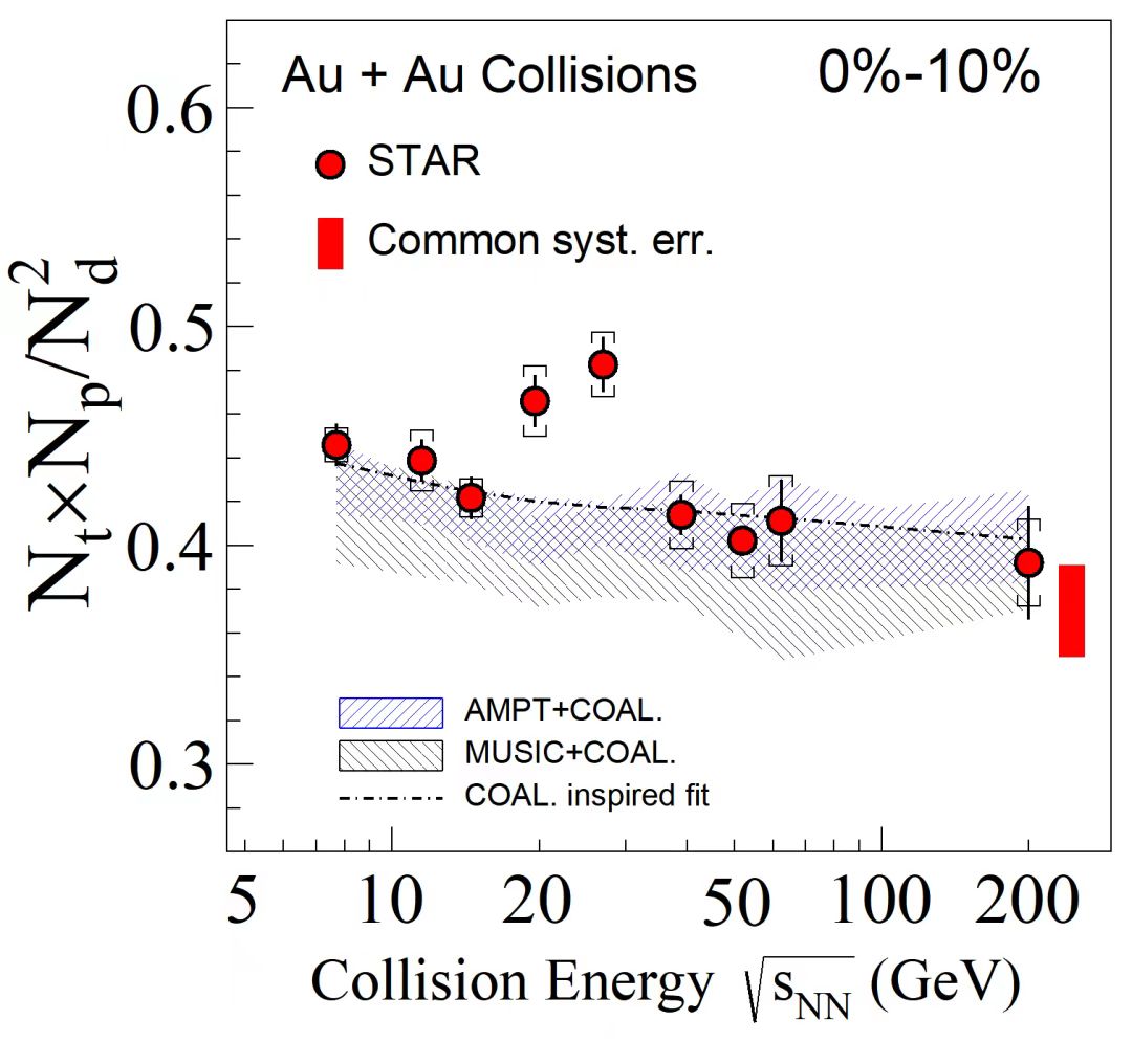 实验观测发现,金核-金核中心碰撞中的轻核复合产额比随着碰撞能量呈现非单调变化行为,产额比在碰撞能量19.6和27 GeV偏离核子合并基线达到了4.1倍的标准差。理论预言,该轻核产额比与中子数密度涨落直接相关,是QCD相变临界点的敏感探针。该实验结果为研究强相互作用相结构、寻找QCD相变临界点提供了重要实验依据,研究成果于5月16日发表在国际权威物理杂志《物理评论快报》上。