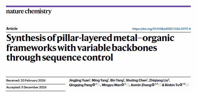 华大在线讯(通讯员 周汉鸣)近日,化学学院涂斌斌副教授团队在金属有机框架序列调控方面取得了重要进展。该研究成果在国际化学领域权威期刊《自然化学》(Nature Chemistry)发表,题为“Synthesis of backbone variable pillar-layered metal–organic frameworks through sequence control”(Nat. Chem. 2025, 17, 421-428)。博士研究生元静静为论文第一作者,通讯作者为武汉科技大学庞青青讲师、万明宇特任教授、郑安民教授和环球在线官网涂斌斌副教授(最后通讯作者),第一完成单位为环球在线官网。
