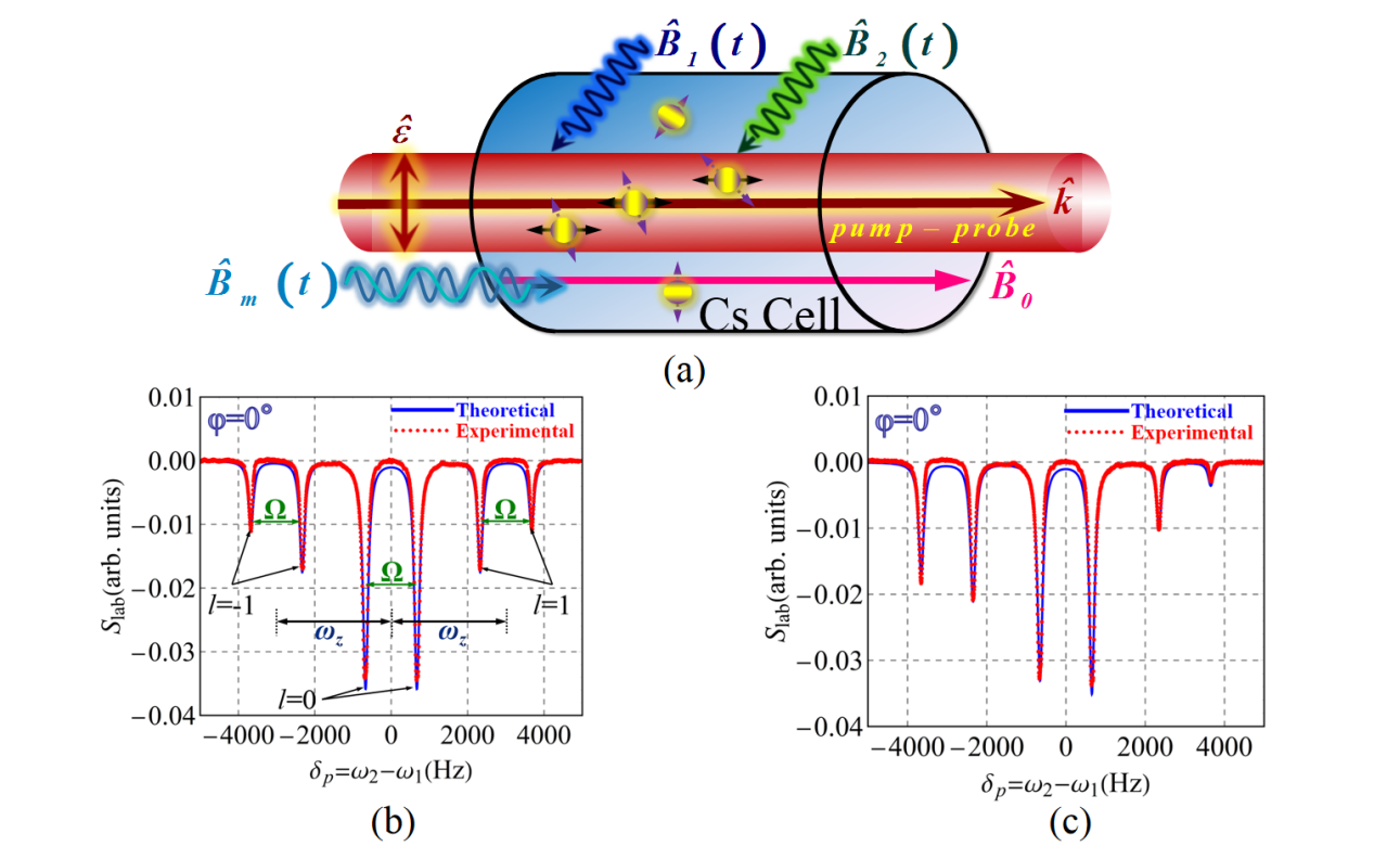 针对这一问题,该研究团队提出了弗洛凯调制角动量为J(J≥1)的多能级热原子磁共振系统高阶极化矩广义宇称理论,研究了具有广义宇称的张量极化矩(alignment)的性质,揭示了广义宇称保护高阶极化矩光谱对称性的物理规律。在此基础上,他们巧妙设计并开展了基于张量极化的周期性驱动激光泵浦-探测铯原子磁共振、从频域直接验证广义宇称保护张量极化光谱对称性理论的实验(如图1所示)。相关研究结果不仅丰富了弗洛凯驱动多能级量子系统高阶极化矩广义宇称理论和实验,还对设计基于高阶极化矩的高灵敏矢量原子磁力仪起着促进作用。